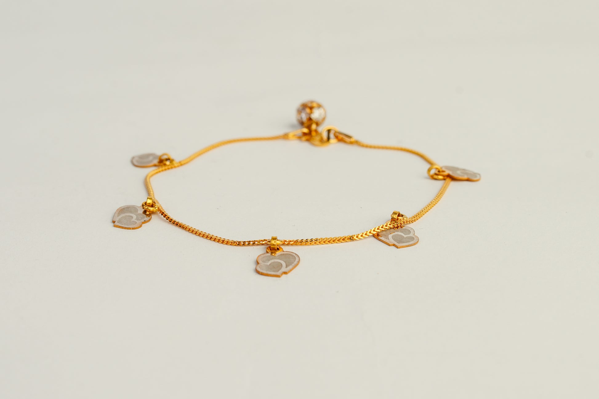 This exquisite gold bracelet from Al Syed features a collection of delicate charms, each intricately designed to add a touch of elegance and charm to your wrist. Perfect for everyday wear or special occasions, this bracelet effortlessly combines sophistication with modern style.