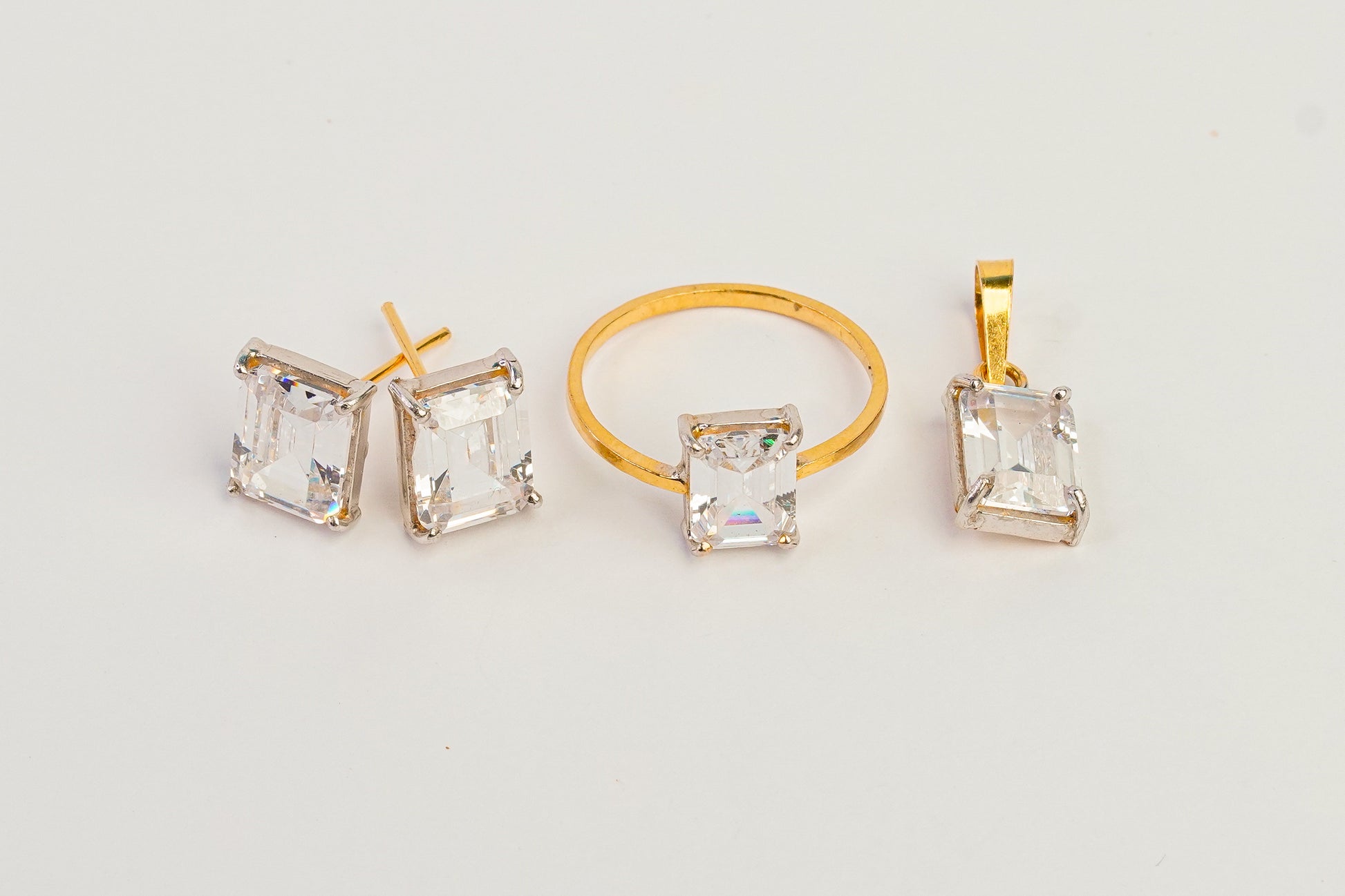 Discover serene elegance with this Al Syed Gold set featuring a minimalist, yet refined design. Adorned with tranquil stones, the matching earrings and pendant provide a calm and sophisticated charm.