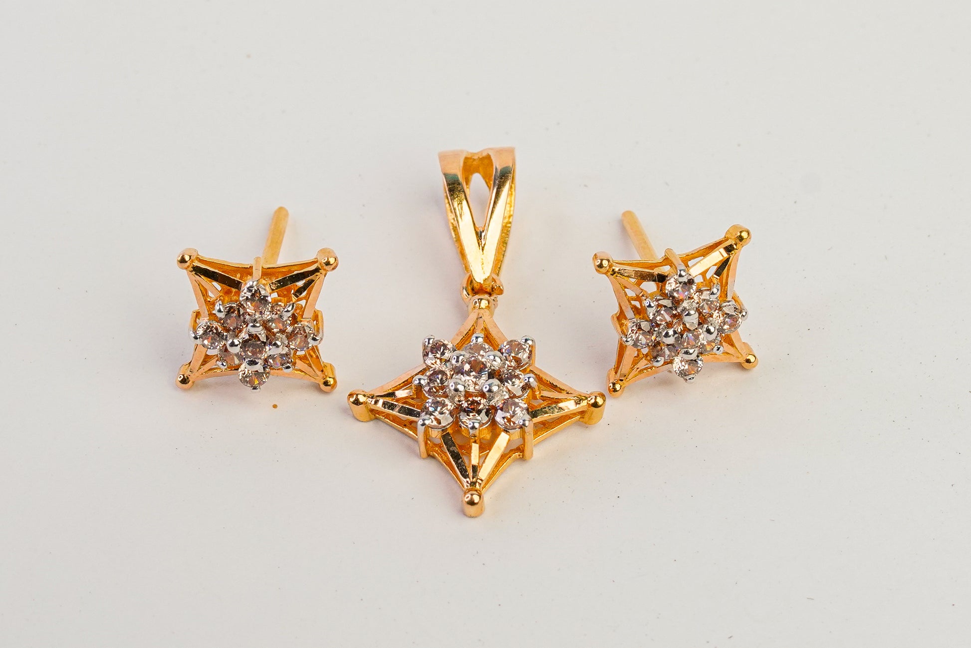 Illuminate your style with this Al Syed Gold set designed with a radiant sunburst pattern. The set is studded with brilliant diamonds and includes matching earrings and a pendant for a dazzling, sun-kissed look.