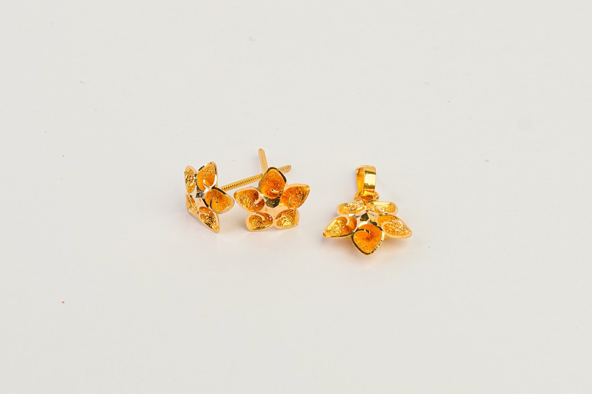 This enchanting Al Syed Gold jewellery set showcases a floral motif with intricate detailing, capturing the essence of sophisticated beauty. Includes matching earrings and a pendant for a graceful, coordinated look.