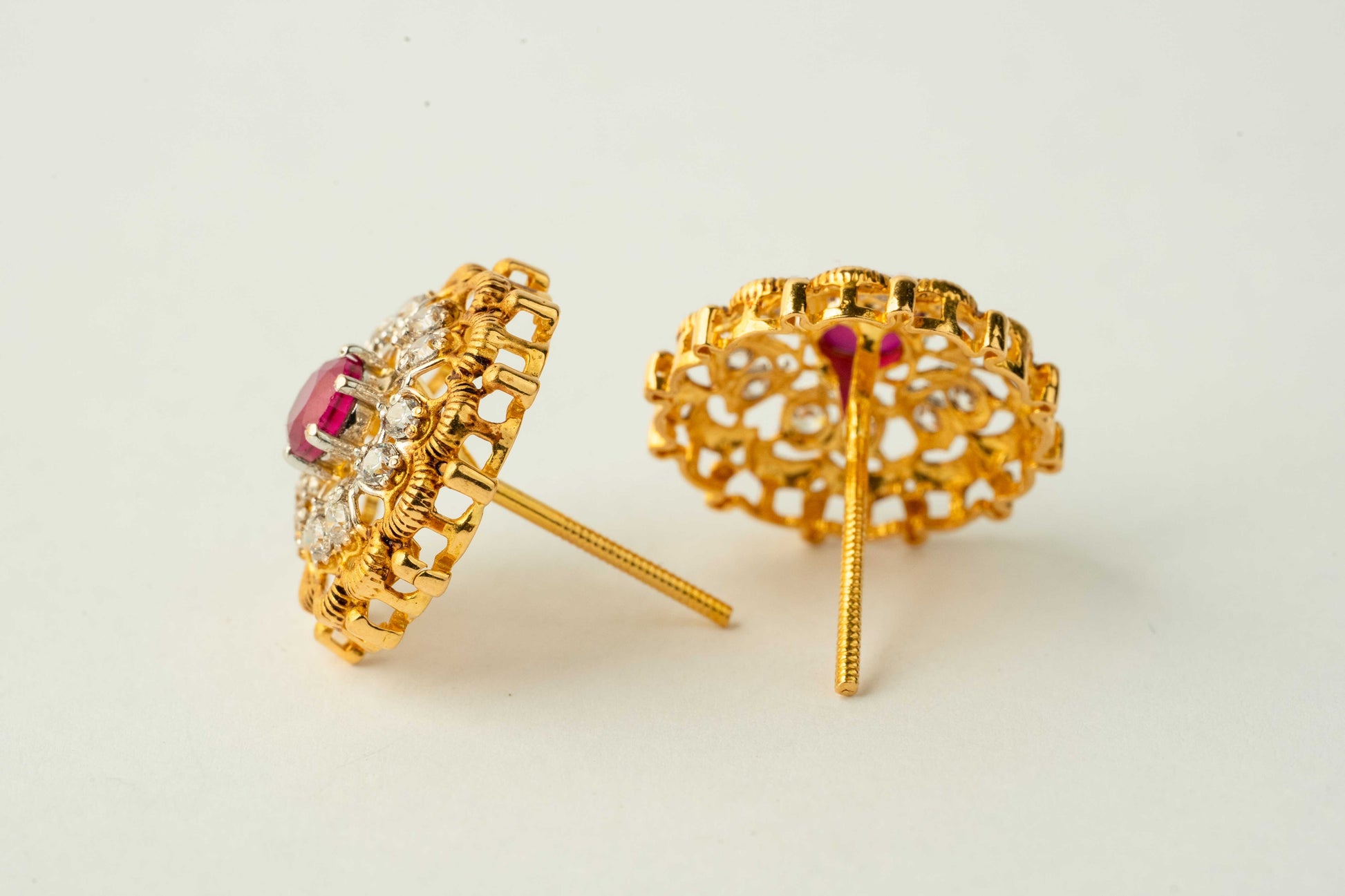 These studs are meticulously crafted by Al-Syed Gold, featuring vibrant ruby centers surrounded by sparkling diamonds. The intricate gold detailing adds a touch of sophistication, making them perfect for special occasions or adding everyday luxury to your style.